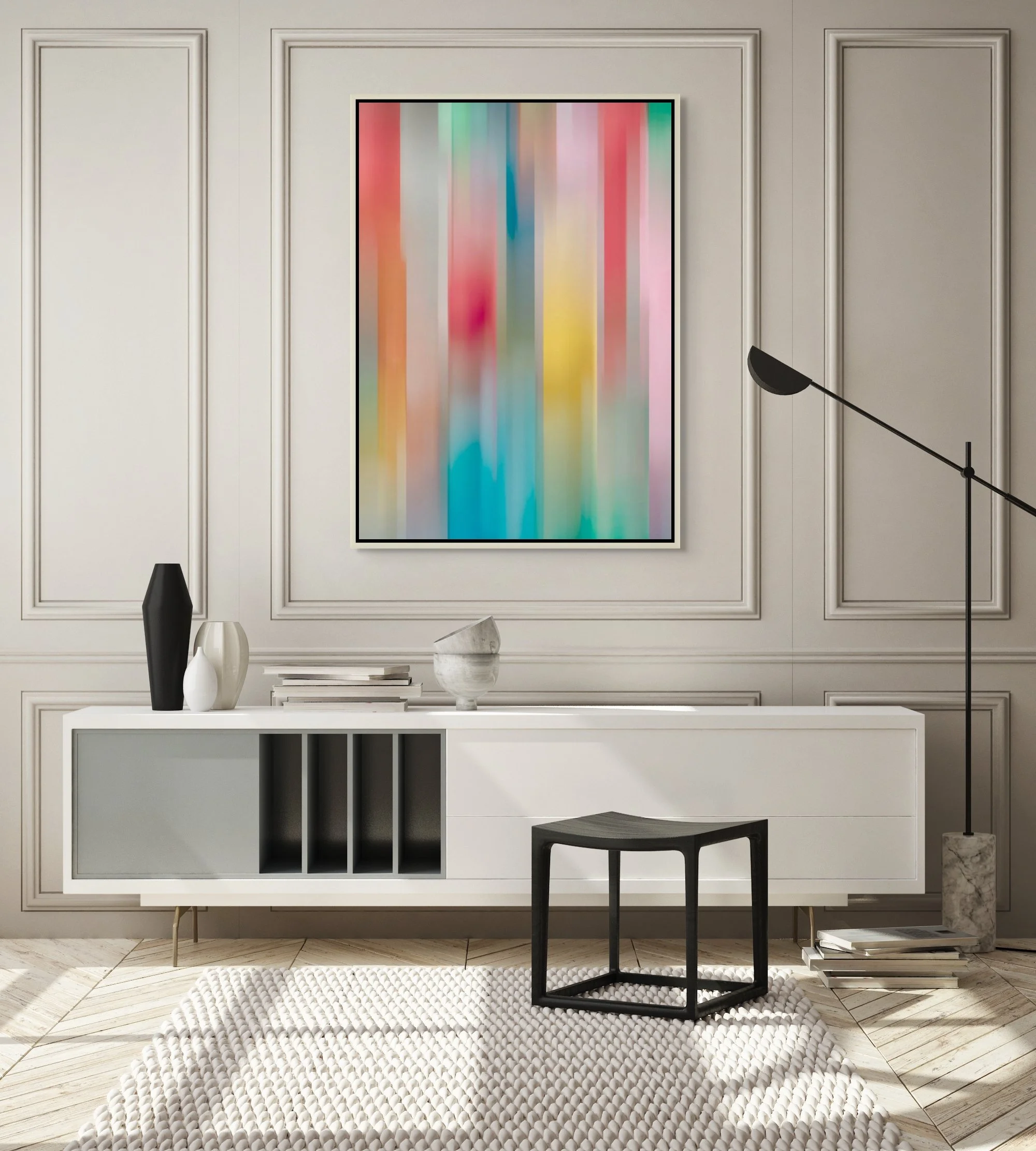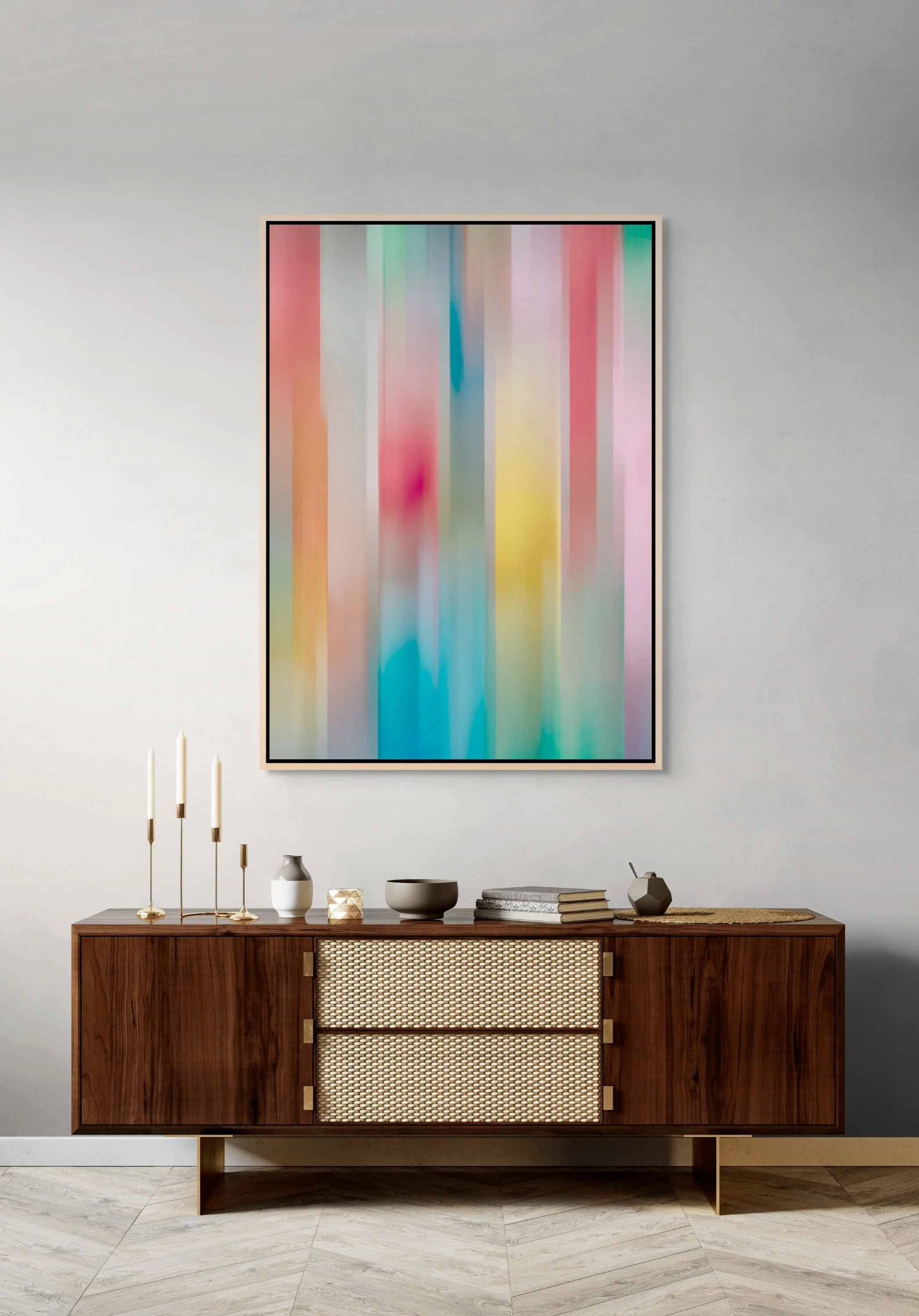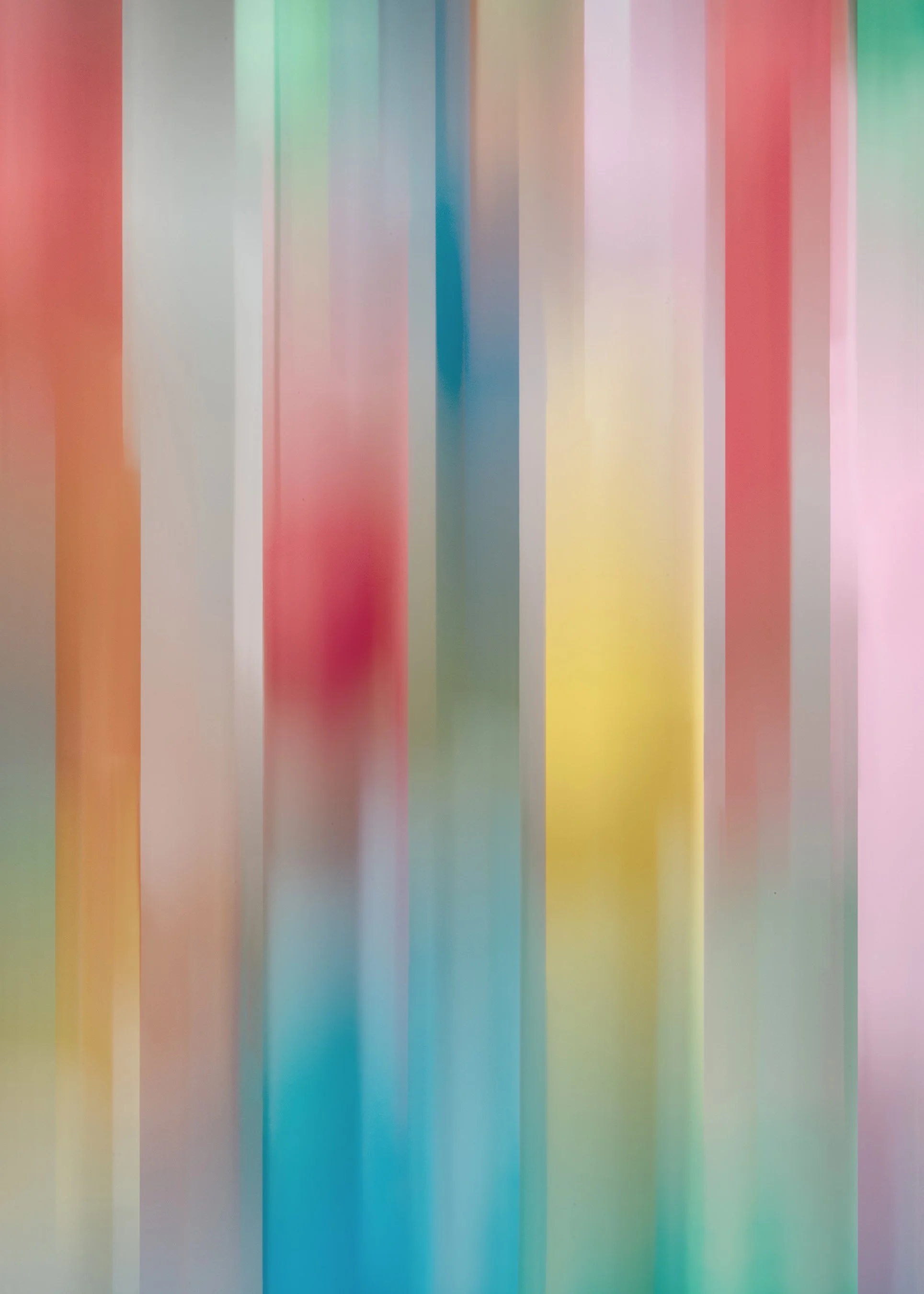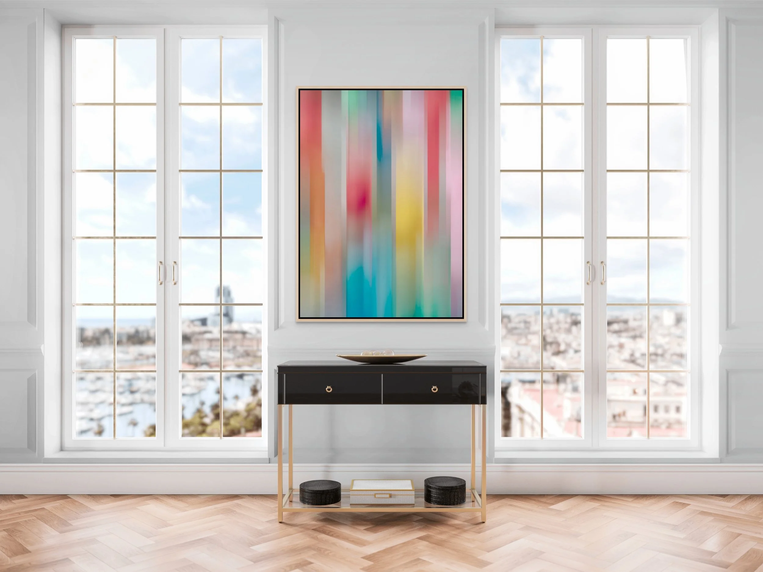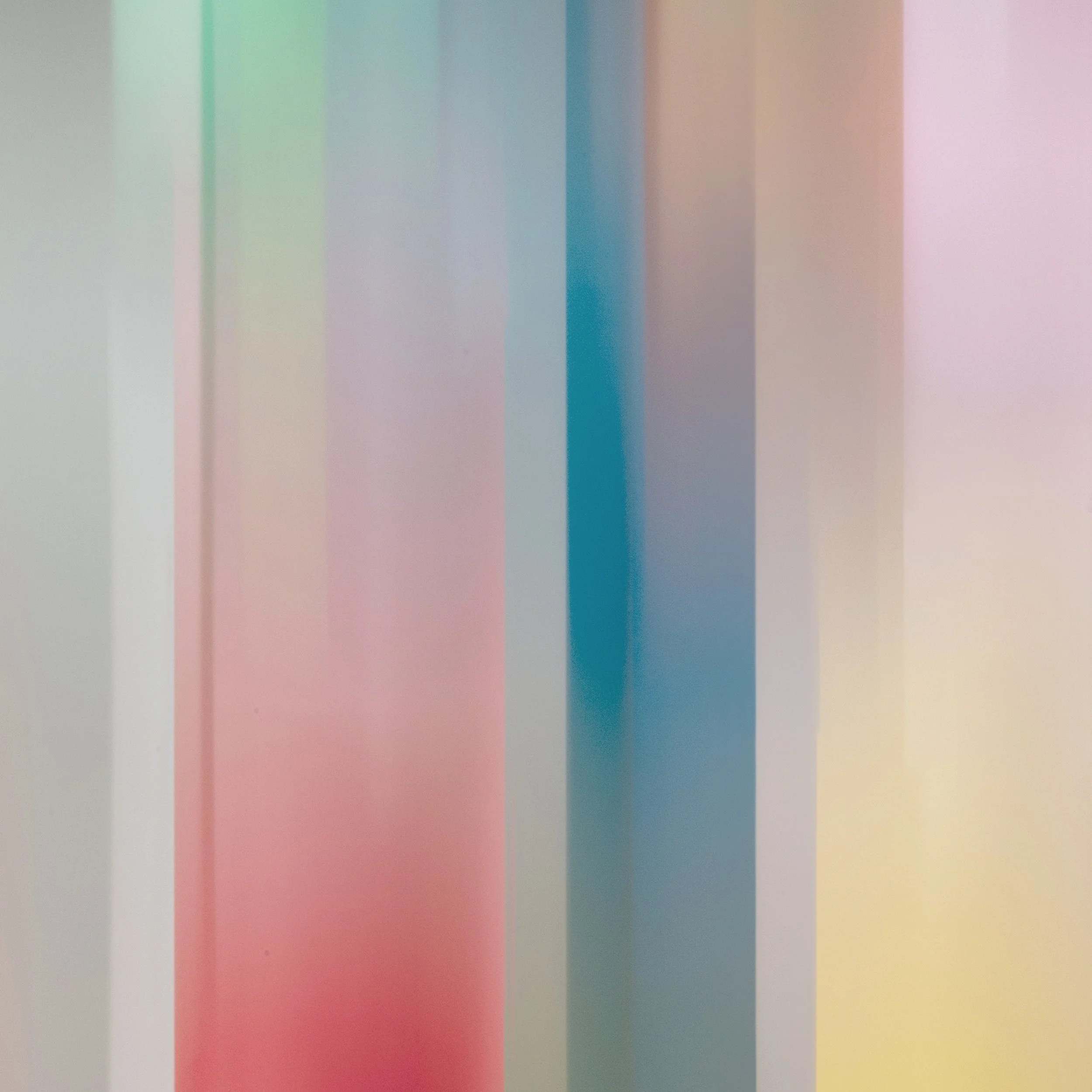 Vertical streaks of turquoise, coral, yellow, and rose shift into one another as if refracted through glass. Part of the Relics series, this work transforms single-use plastics into painterly light, blurring the line between waste and wonder.
